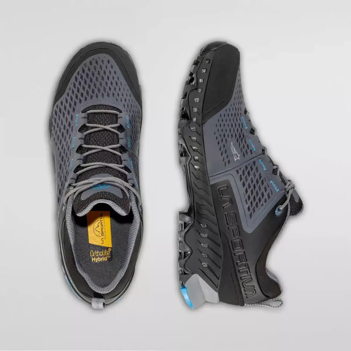 Spire es una zapatilla de nueva generación para el senderismo rápido. Adopta soluciones que forman parte del ADN de montaña de La Sportiva, combinando tecnologías y conceptos derivados de las categorías Mountain Running y Mountain para crear un calzado versátil, impermeable y transpirable en 360° gracias a la nueva tecnología GORE-TEX SURROUND®: la membrana exclusiva que garantiza una transpirabilidad en 360° gracias a la mayor superficie de aireación que abarca la parte superior, la plantilla y la entresuela de EVA con salidas de ventilación laterales en TPU. Los canales de aireación visibles a lo largo del perfil de la entresuela están protegidos por una malla de nailon extremadamente resistente, que evita que las piedras y otras impurezas entren en las salidas de ventilación. La parte superior de corte medio utiliza la estructura Nano-Cells 2.0™, unas células supertranspirables que actúan en sinergia con la membrana GORE-TEX SURROUND® para proporcionar unos niveles de transpirabilidad sin precedentes. La parte inferior de la bota incorpora el Stability Control System™, un sistema de control de la estabilidad que integra las salidas de ventilación con la tecnología GORE-TEX SURROUND®. La suela Vibram XS Trek proporciona un excelente agarre en terrenos duros, blandos y embarrados. Se garantiza una transpirabilidad y comodidad totales.