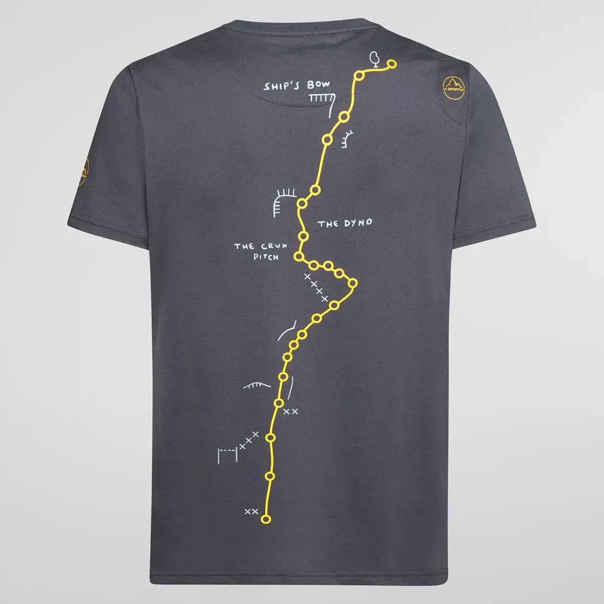Viva la legendaria escalada con nuestra camiseta exclusiva, que luce el intrincado gráfico de la ruta Dawn Wall. Esta camiseta es un homenaje al viaje de los escaladores por la pared más difícil del mundo. Diseñada para aquellos que aprecian el arte de la escalada, presenta la representación de los largos de la ruta, invitándole a seguir los pasos de las leyendas.