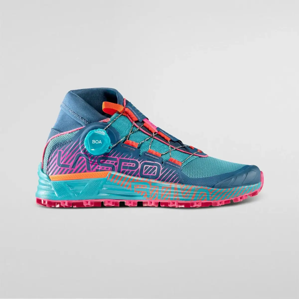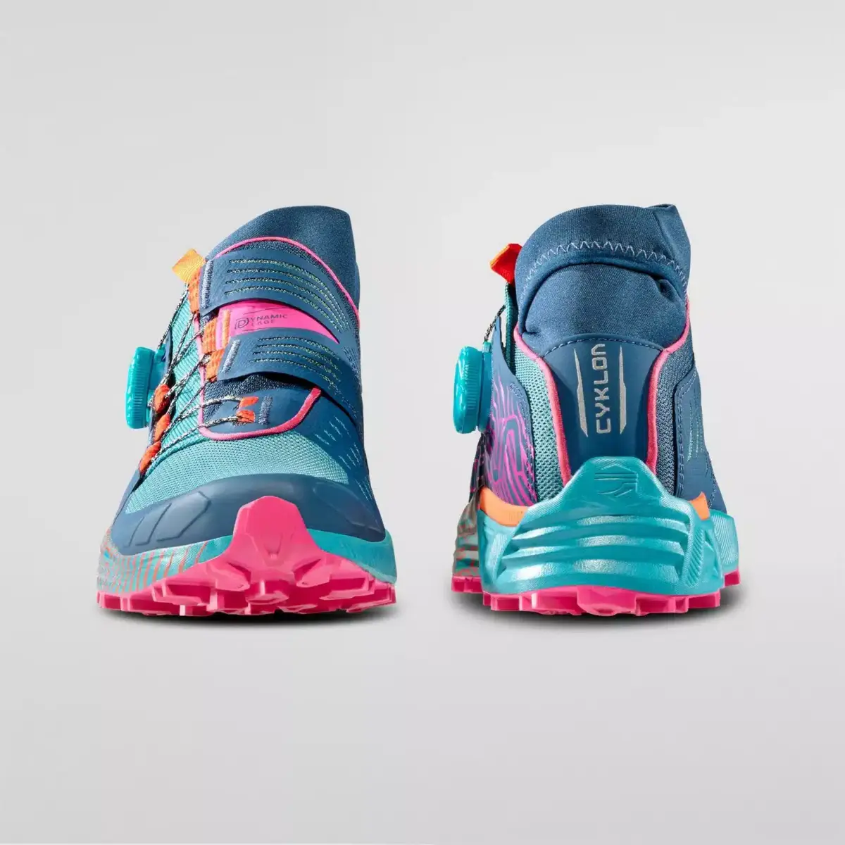 Cyclon es el calzado de alto rendimiento para skyraces y carreras todoterreno en terrenos técnicos de media distancia. Fruto de la investigación y el desarrollo de La Sportiva y BOA®, es un producto que garantiza estabilidad, precisión y un ajuste perfecto gracias al nuevo sistema de cierre Dynamic Cage™ con BOA® Fit System integrado, que actúa en sinergia con tres elementos diferentes de la parte superior para una sujeción y estabilidad perfectas del pie y un descenso seguro y preciso. El corazón del sistema de cordones es el Dynamic Flap™ interno que envuelve el calzado y permite un ajuste dinámico de la tensión actuando directamente sobre el BOA® Fit System con un solo movimiento de la mano. La puntera protectora de TPU y el panel lateral multicapa termoadhesivo proporcionan una estructura adicional y protección contra los impactos. La suela para terreno fangoso, ideal para su uso en terrenos blandos y embarrados, está fabricada con el compuesto La Sportiva FriXion® White de gran agarre y ofrece la posibilidad de integrar clavos AT Grip Spike en caso de uso en terrenos helados. La entresuela de EVA de doble densidad con inserción estabilizadora contribuye a la estabilidad general de la bota y reduce el peso. Cyklon: flota como una mariposa, corre como el viento.