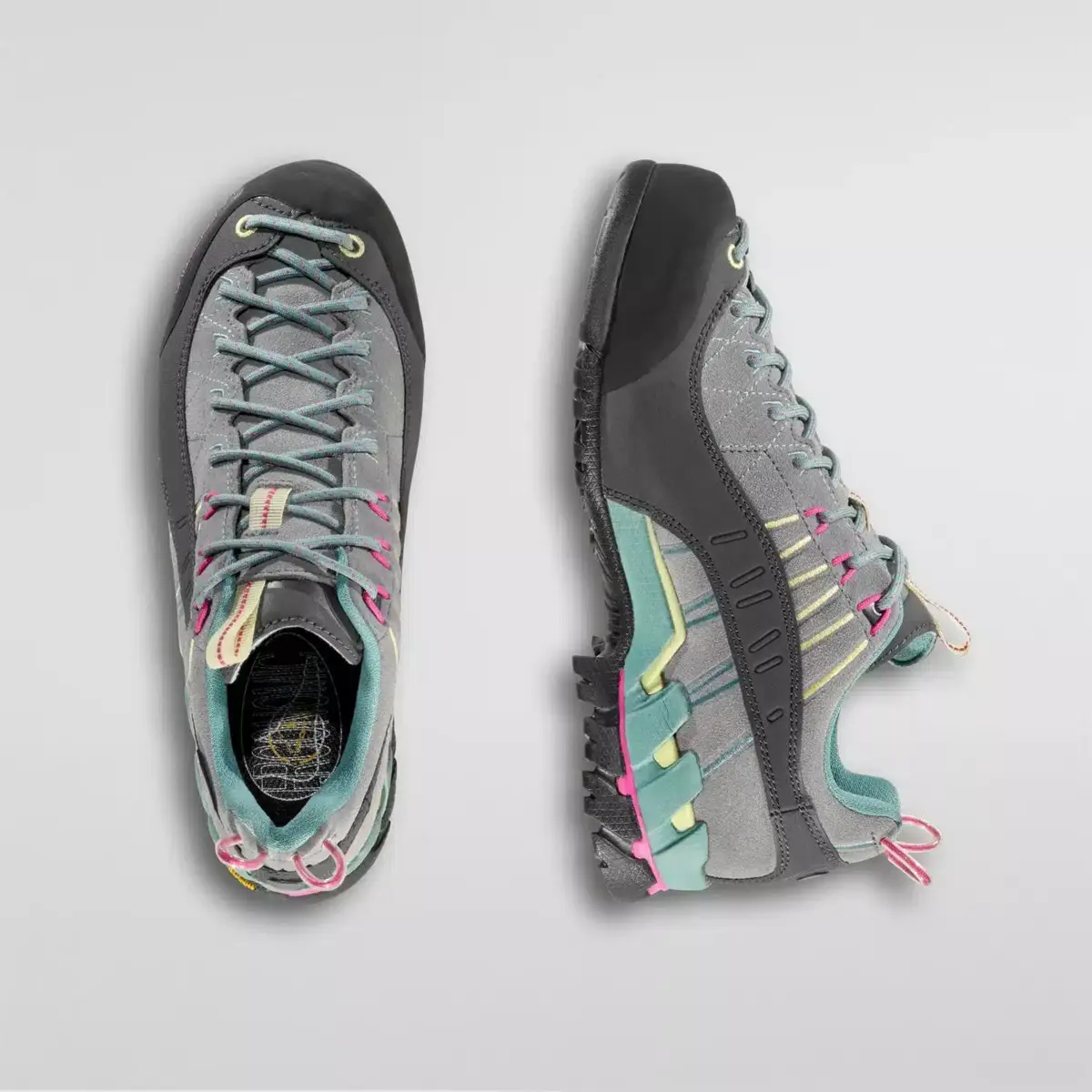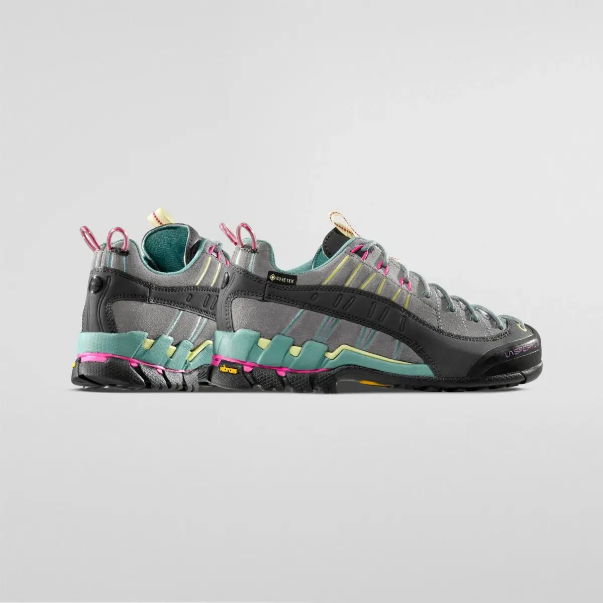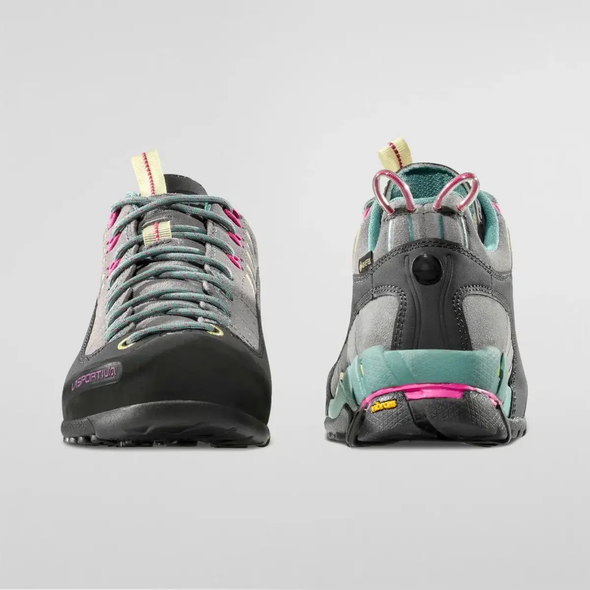 El forro Gore-Tex garantiza una bota ligera, impermeable y transpirable, gracias también a la parte superior de malla. El ajuste preciso y ergonómico se consigue mediante el uso de cordones envolventes que se ajustan a 360° al sistema de cordones mediante una serie de aros y refuerzos de alta frecuencia. Este método de construcción se deriva de la experiencia adquirida por La Sportiva en el ámbito de la escalada. La puntera protectora de goma también proviene de las zapatillas de escalada. La cuña de la entresuela «Rock Guard» contiene una capa de EVA con una almohadilla inyectada que absorbe los impactos en el talón y ofrece un mayor apoyo al tobillo para evitar la torsión del pie. La suela Idrogrip Vibram ha sido creada según las características específicas y contiene zonas graduadas: la zona de escalada en la puntera, ventosas laterales de diferentes tamaños y una almohadilla que absorbe los impactos en el talón.La tecnología más innovadora de La Sportiva aplicada a las zapatillas de aproximación.
